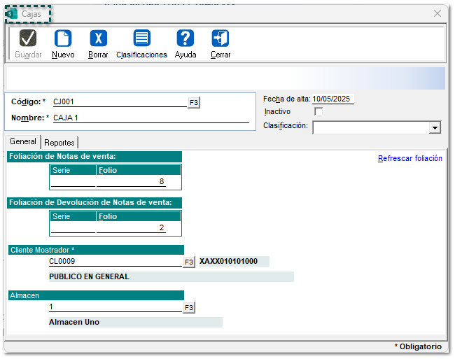 Antes de capturar información en las Notas de venta, asegúrate de previamente haber asignado y configurado una Caja desde el menú Punto de venta / Cajas: