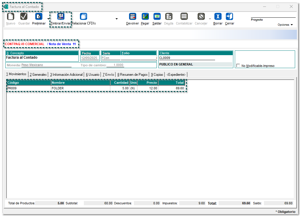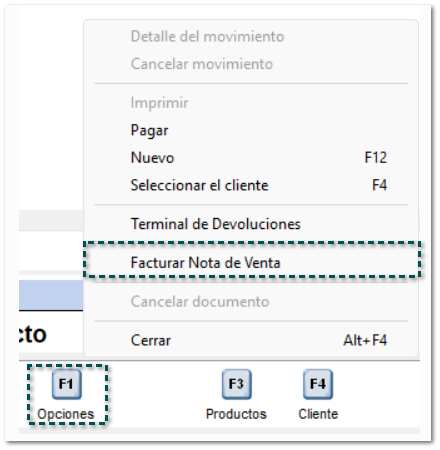 | | Antes de facturar una Nota de Venta debes tener en cuanta las siguientes consideraciones:La Nota de venta no debe estar incluida en una Factura global.La Nota de venta no deberá estar pagada, cancelada y/o facturada.Una vez revisado lo anterior, realiza lo siguiente: Paso Una vez pagada la Nota de venta, haz clic en el botón Opciones <F1> y selecciona la opción “Facturar Nota de Venta”:![]() Se mostrará la ventana con los documentos abiertos, por lo que deberás elegir la Nota de venta a facturar y selecciónala con doble clic:![]() Luego, se abrirá una ventana para indicar el concepto de factura:![]() Automáticamente se mostrará la ventana de la factura generada a partir de la nota de venta, en la cual desde la pestaña 2. Generales podrás capturar el RFC y Razón social de un cliente distinto y posteriormente Timbrarla y Entregarla:![]() Recuerda Para consultar las Facturas creadas, ve a CONTPAQi Comercial Premium® menú Movimientos / Ventas / Facturas. ¡Y listo!, así podrás Facturar una Nota de venta. |