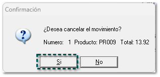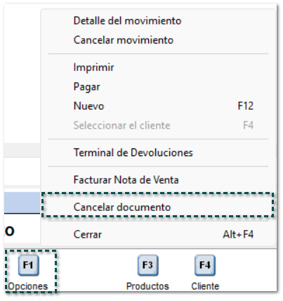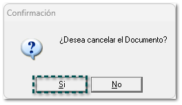 | | Para cancelar toda la nota de venta junto con sus movimientos / productos incluidos, realiza lo siguiente:Paso Haz clic en el botón Opciones <F1>, y elige la Cancelar documento:![]() Aparecerá un mensaje de “Confirmación” preguntando si se desea cancelar el documento, y haz clic en el Sí:![]() Recuerda Una vez cancelado el documento, ya no podrás agregar más movimientos al documento. ¡Y listo!, así podrás Cancelar todos los movimientos del documento de la Nota de venta. |