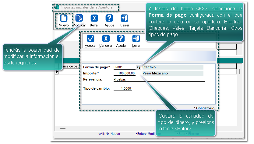 Después de la apertura de la caja, deberás definir y registrar los importes iniciales, es decir; el dinero en el cajón, para esto haz clic en el botón Nuevo y al terminar de definir la información, elige el botón Aceptar.