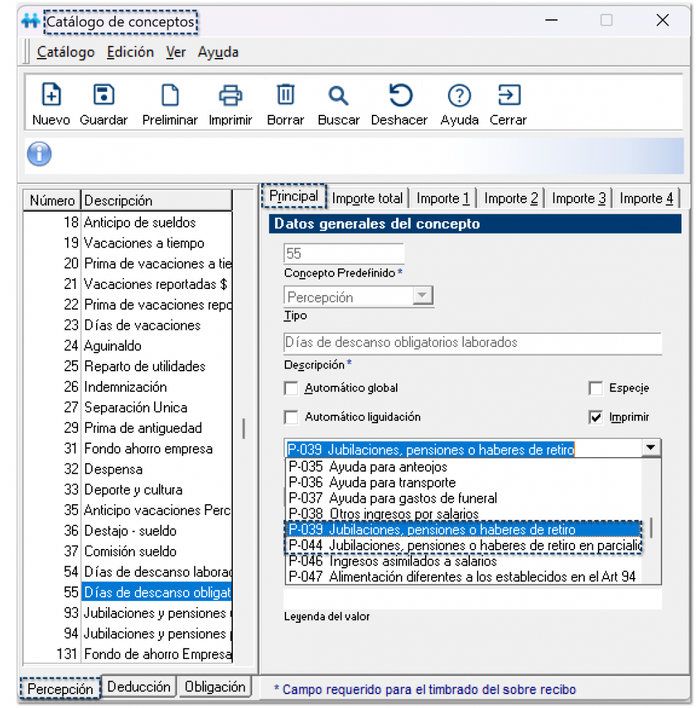 Para poder registrar correctamente los pagos de jubilación o pensión, se agregan los siguientes conceptos dentro del sistema: