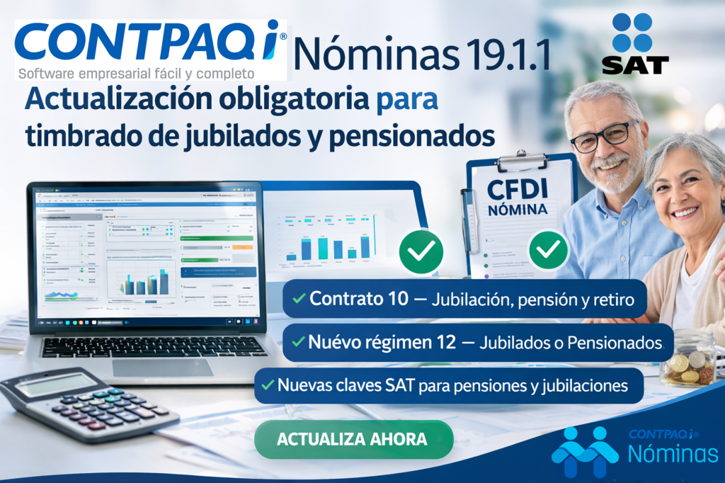 La versión 19.1.1 de CONTPAQi Nóminas incorpora mejoras enfocadas en el cumplimiento fiscal para el timbrado de pagos a jubilados y pensionados, permitiendo configurar correctamente a los empleados y generar el CFDI de nómina conforme a la normativa vigente del Servicio de Administración Tributaria (SAT).