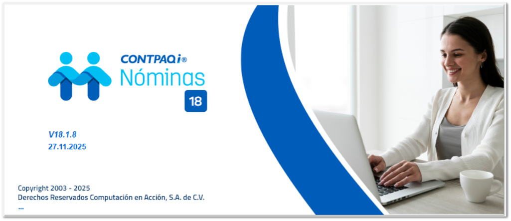 Después de instalar esta solución, al abrir el sistema te mostrará el Splash que indica que cuentas con la versión 18.1.8 de CONTPAQi Nóminas®.Esto nos indicará que ya cuentas con la solución fuera de versión.