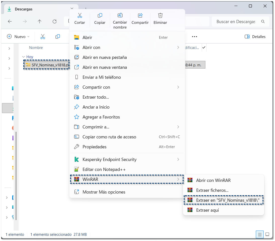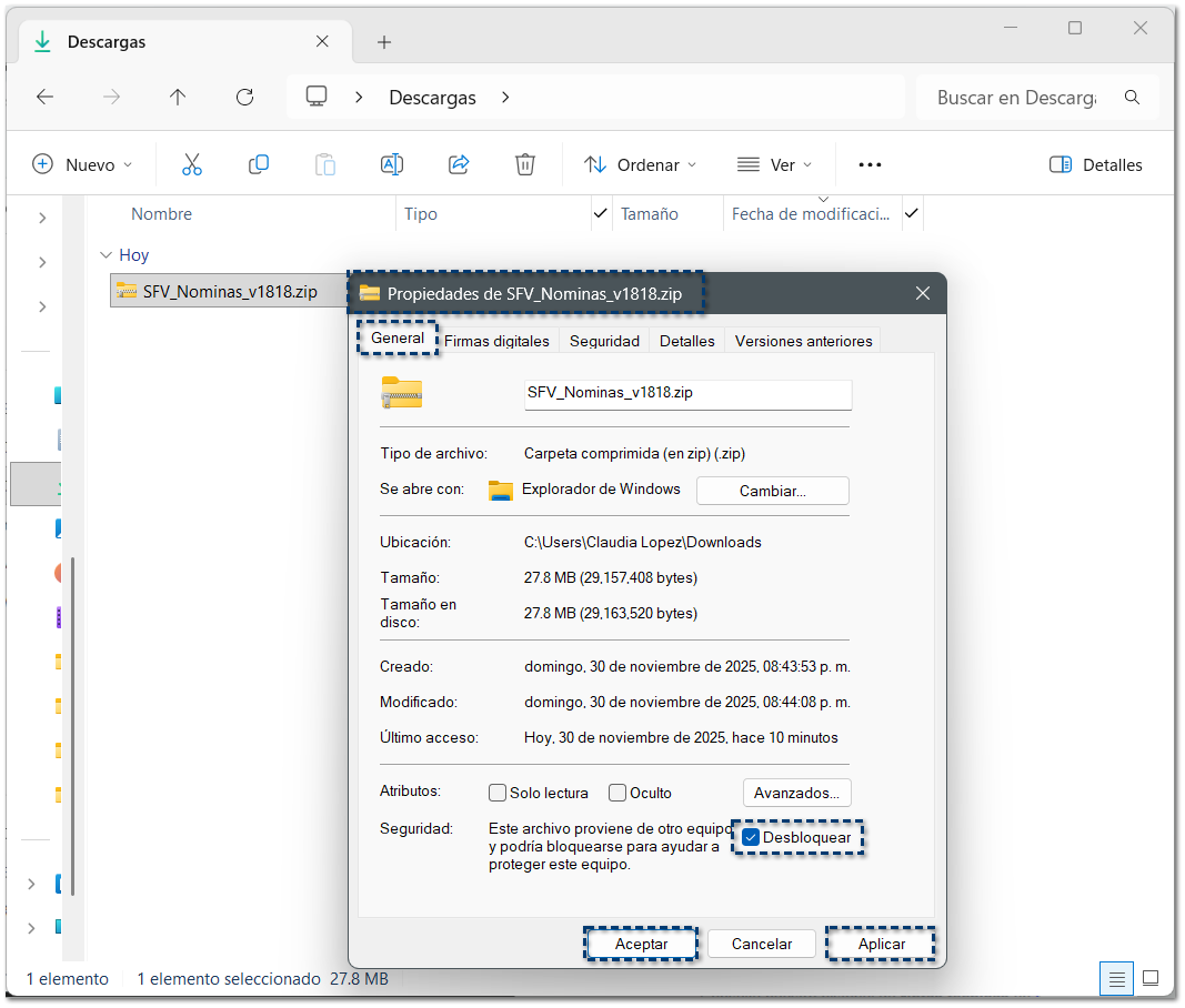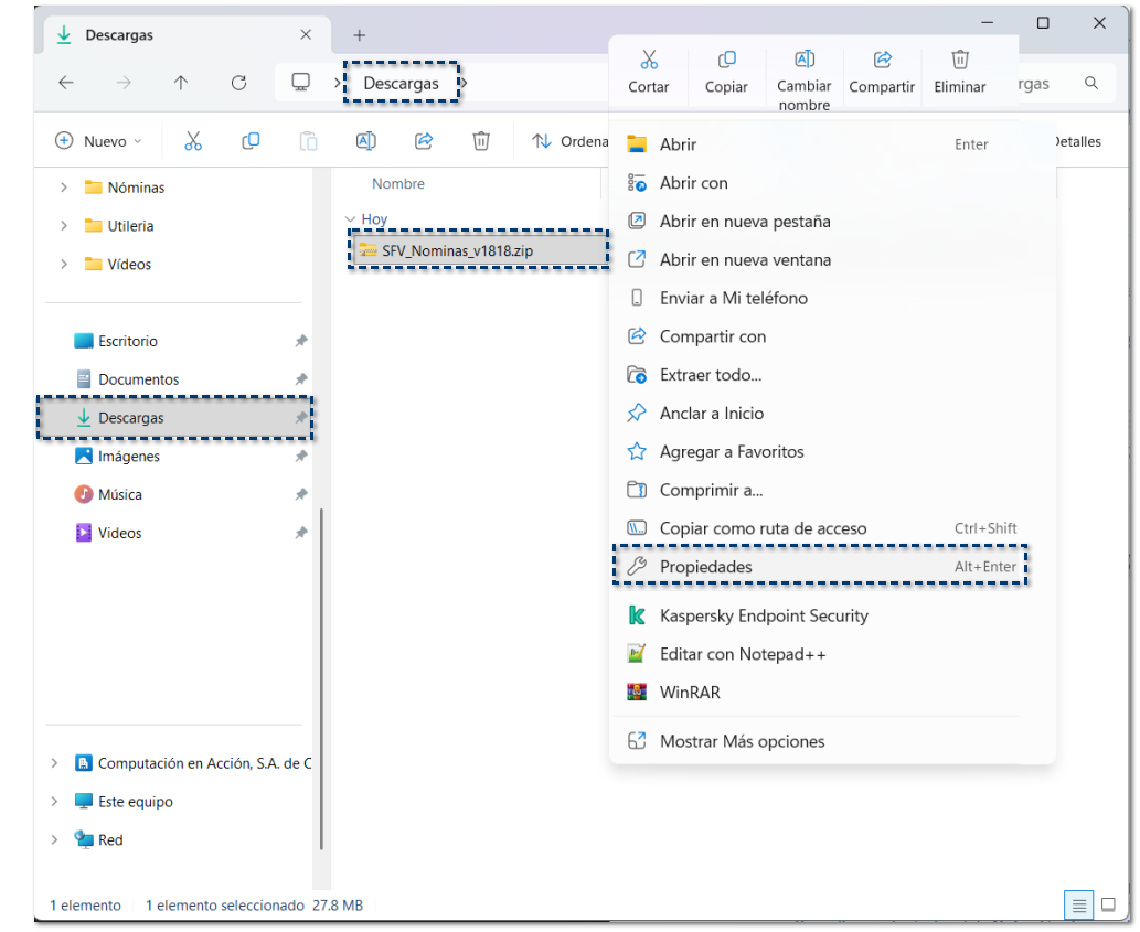 Ingresa a la carpeta de Descargas de tu equipo.Selecciona la carpeta SFV_Nominas_v1818.zip y haz clic derecho, selecciona la opción Propiedades.