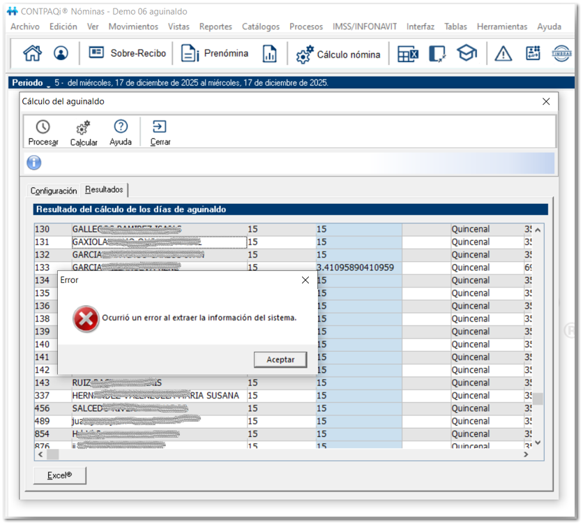Si al calcular el aguinaldo en CONTPAQi Nóminas® te aparece el mensaje “Ocurrió un error al extraer información del sistema”, no te preocupes: este aviso te ayuda a solucionar el detalle, ocurre cuando se ejecuta el proceso en un periodo extraordinario, pero no afecta el cálculo ni los resultados de la nómina. En este artículo te explicamos por qué se presenta este error en CONTPAQi Nóminas 18.1.5, cómo evitarlo temporalmente y cuál es la solución definitiva mediante la actualización fuera de versión 18.1.8, para que puedas realizar el cálculo del aguinaldo sin errores, con total seguridad y conforme a los lineamientos del sistema de nóminas más utilizado en México.