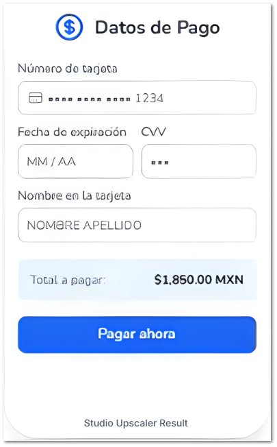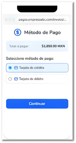 ![]() | Opciones de pago disponibles: El cliente o usuario puede elegir entre diferentes métodos de pago según preferencia, por ejemplo; “Tarjeta de débito”, o “Tarjeta de débito”.![]() Nota: Al ofrecer múltiples opciones de pago, aumenta las probabilidades de que el cliente complete la transacción. | |