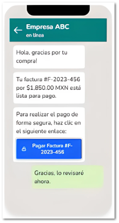 ![]() | Recepción: El cliente o usuario recibe un mensaje, para este caso, un mensaje de Texto o WhatsApp, con un enlace para realizar el pago de forma segura.![]() Nota: La Liga de Pago, es un enlace único y seguro que dirige al cliente a una plataforma de pago. | |