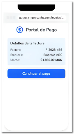 ![]() | Acceso: El cliente o usuario hace clic en la Liga de Pago. Al hacer clic en dicho enlace, es dirigido a una página web segura donde podrá realizar el pago.![]() Nota: La página del pago, se abre directamente en el navegador del dispositivo, sin necesidad de descargar aplicaciones. | |