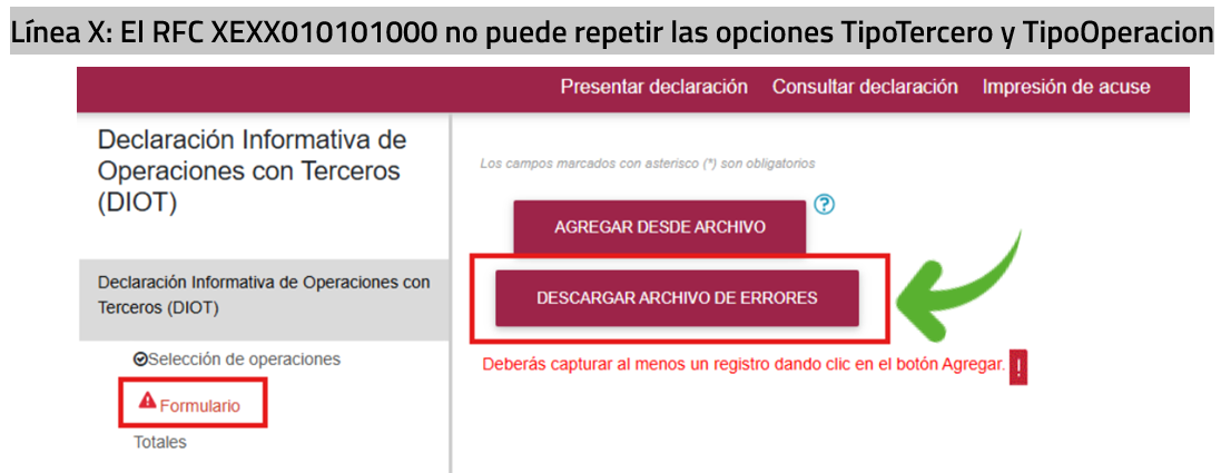 Solución en DIOT SAT: Línea X – El RFC XEXX010101000 no puede repetir las opciones TipoTercero y TipoOperacion