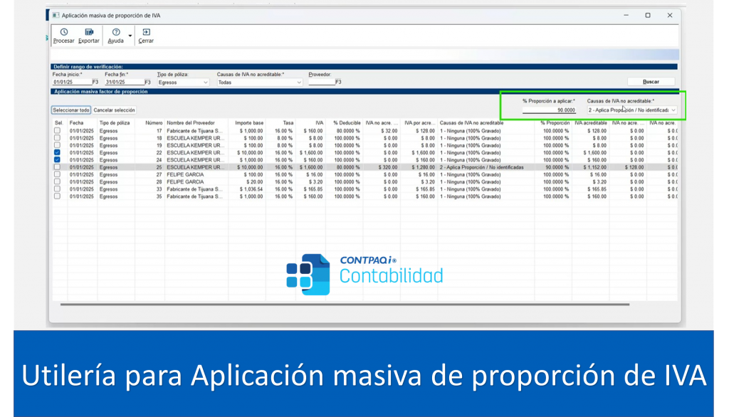 La nueva herramienta de CONTPAQi® automatiza la aplicación de la proporción de IVA en múltiples pólizas, sin tener que editar cada una por separado.