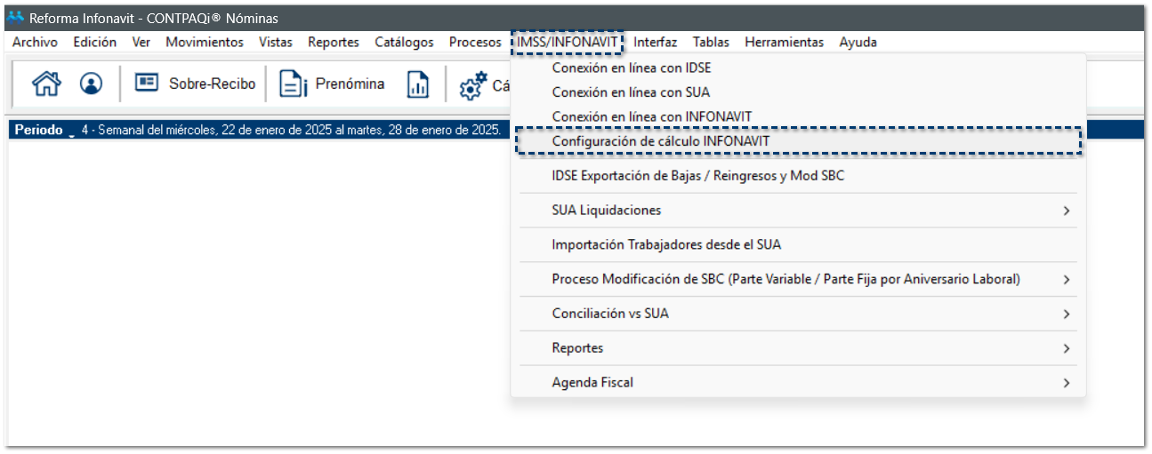 Al ingresar al menú IMSS/INFONAVIT, visualizarás el nuevo submenú Configuración de cálculo INFONAVIT: