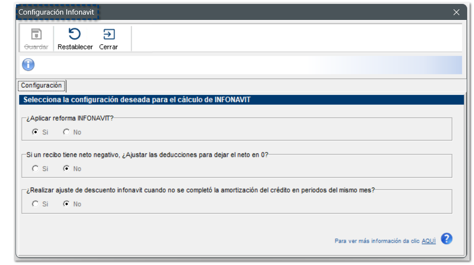 Al seleccionar esta opción, se mostrará la ventana Configuración INFONAVIT, en la que podrás configurar los parámetros para el cálculo de INFONAVIT: