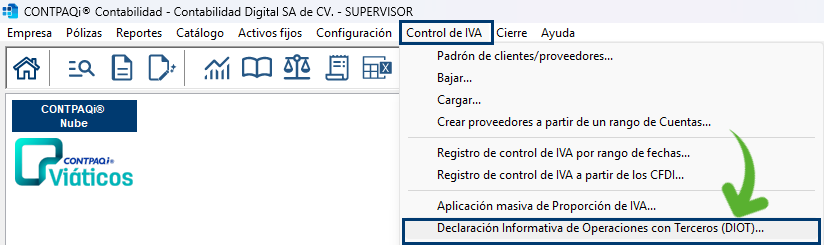 Al generar el archivo de la DIOT en formato Excel® desde el menú Control de IVA, seleccionando la opción “Declaración Informativa de Operaciones con Terceros (DIOT)“.