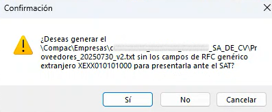 Y te preguntará si deseas generar el archivo sin los campos del RFC genérico extranjero XEXX010101000 para presentarlo ante el SAT.
